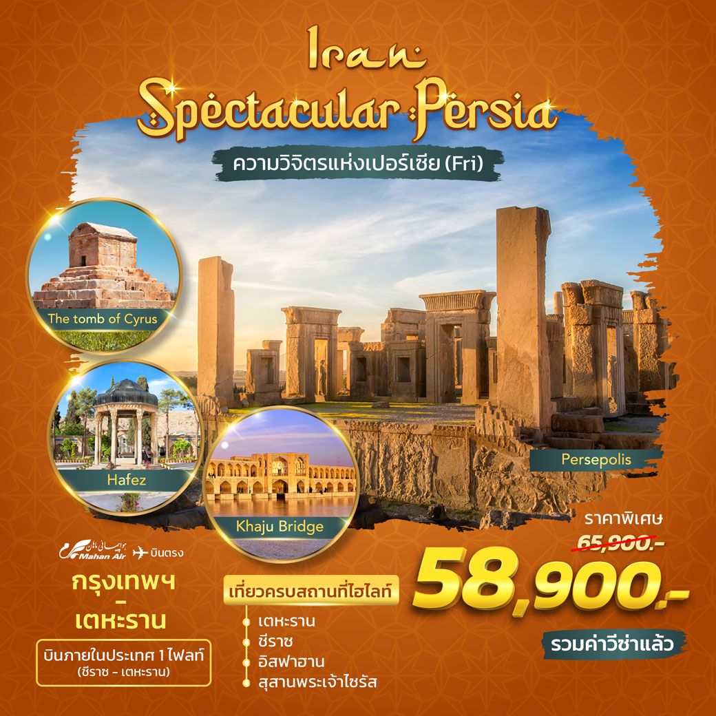 เที่ยวอิหร่าน8วัน6คืน บินตรงโดยสายการบินมาฮานแอร์ (Mahan Air) ชมหมู่บ้านโบราณแห่งเมืองคาซาน ชมนครโบราณอาณาจักรเปอร์เซีย Persepolis ชมมัสยิดสีชมพูที่สวยงามที่สุดของอิหร่าน สถาปัตยกรรมวิจิตตระการตา Palace of the Flower ชมจัตุรัสอิหม่ามที่ใหญ่เป็นอันดับ 2 ของโลก ชมSunsetพร้อมดินเนอร์ ปิคนิคบาร์บีคิว ณ ทะเลทราย ช้อปปิ้งของ